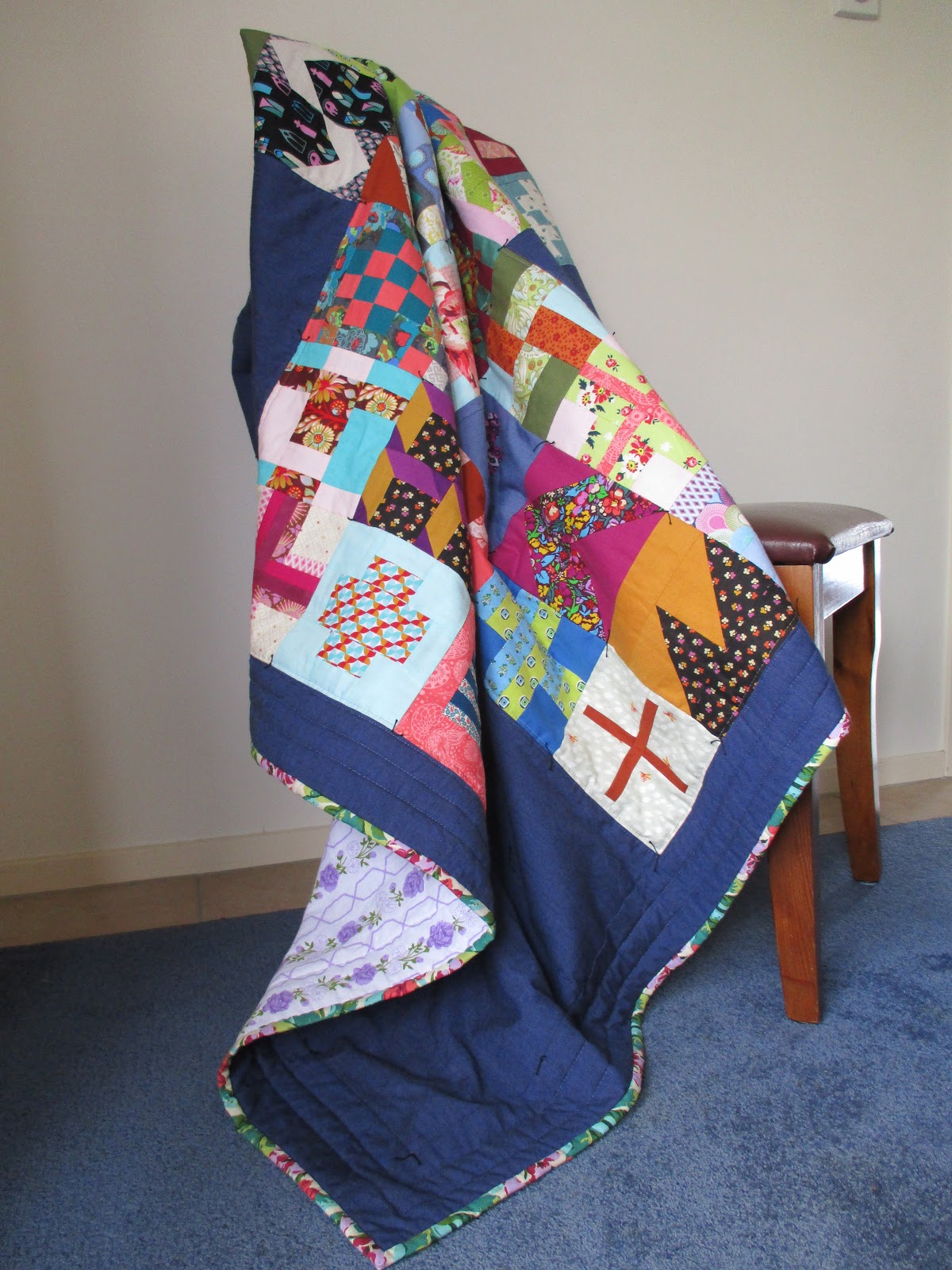 Some machine quilting was done around the border of the quilt to hold it's shape and around the sampler cross, however I wanted a quilt that was soft, snuggly and lightweight for her, not stiff with lots of quilting, I decided to tie the rest of it after reading this post from kokaquilts. I used black DMC perle 8 and tied on the corner of each sampler block then at 6" intervals on the blue. I am delighted with how soft and drapey the quilt has turned out, and how easy it was to tie it.